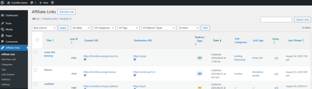 After activation, go to Affiliate Hub > Add New Link. Enter your affiliate URL, choose a custom slug, add categories/tags, and save. Your short link will be automatically generated.