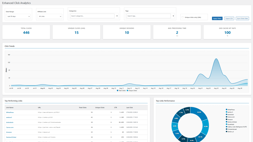 Yes! Affiliate Hub provides comprehensive analytics including total clicks, unique visitors, top-performing links, and exportable data in CSV/JSON format.